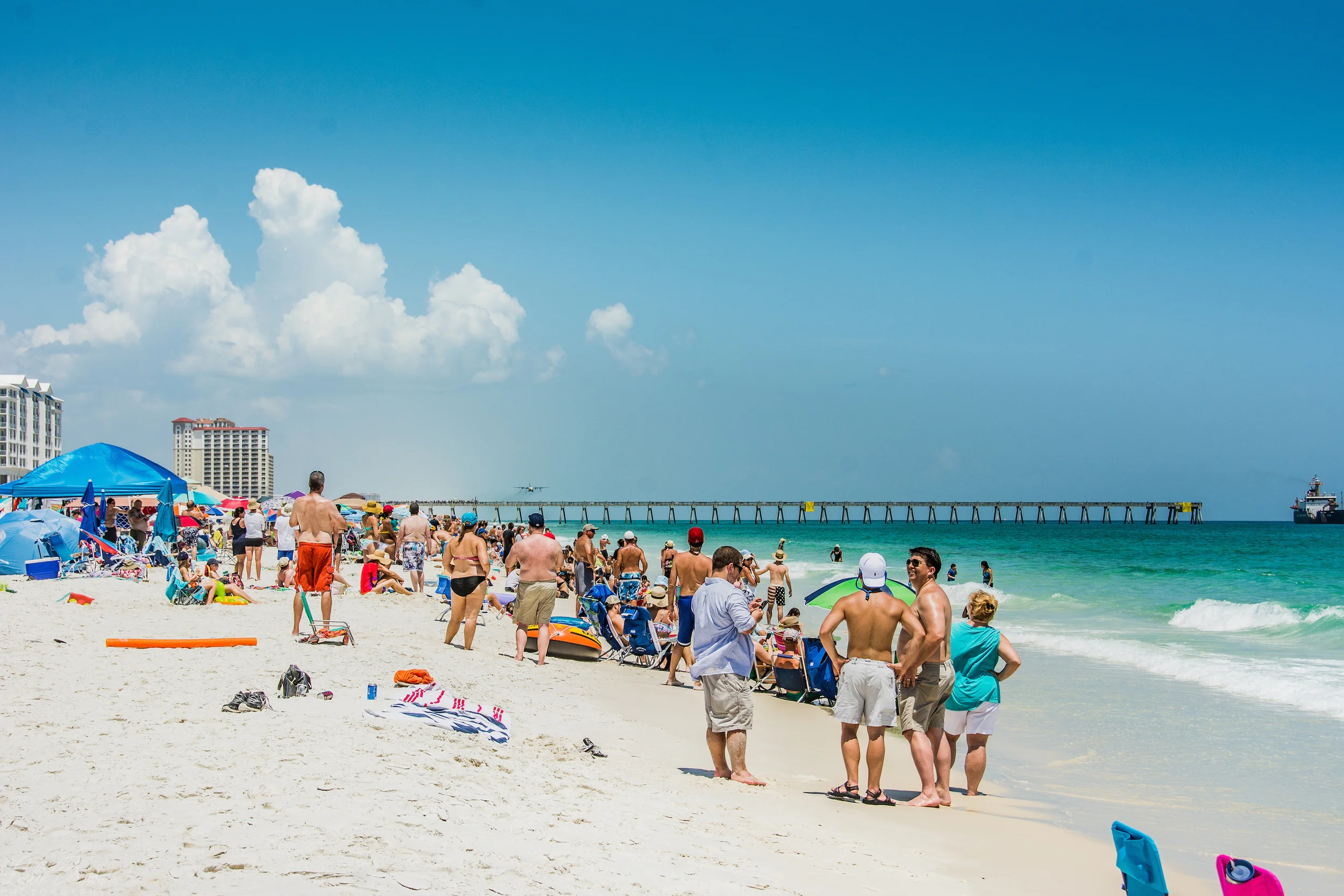 The Blue Angels - based out of the Pensacola Naval Air Station, actually fly all over the country throughout the year, and the show is always amazing, but there something about the airshow on the beach that is extraordinary. It's home, familiar, and it's dramatic - because they fly so very close to the ground and love to thrill the crowd with surprises. These guys literally seem to appear out of nowhere and buzz the crowded bays and beaches with thunderous fly-bys.